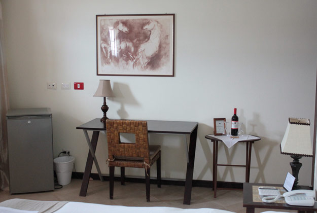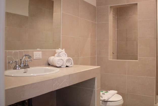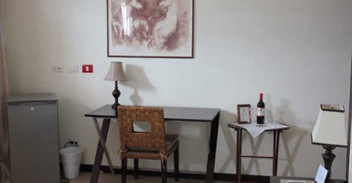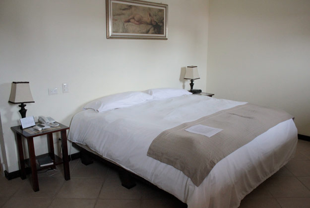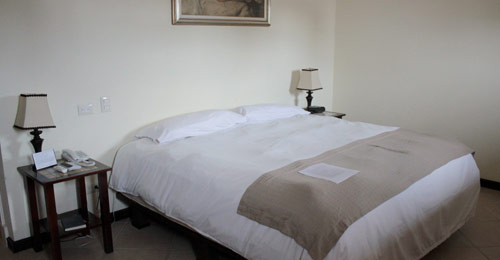 1 King size bed with comfort gel pillow top. 27 inch flat screen TV, mini frig, beautifully tiled floors. Air conditioner, Wi Fi and cable access for your personal computer, as well as a desktop computer are provided for your use at no charge. European 220 volt and American 110 volt. In-room telephone with free international calls and internet access.